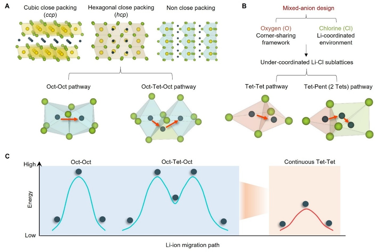 基于长期在卤化物固态电解质的研究基础,孙学良院士团队及其合作者设想了一种混合阴离子策略(例如,氧和氯),旨在设计一个氧角共享的氧氯化物阴离子框架结构,以诱导形成连续的“Tet-Tet”低能垒锂离子迁移通道(图1)。另外,鉴于不同阴离子化学在离子电导率和(电)化学稳定性方面的独特优势,这种方法有可能在保持高离子电导率的同时,替代液态电解质并增强(电)化学稳定性,与之一同发展的混合阴离子化学也将会成为一种有前景而亟需探索的领域。