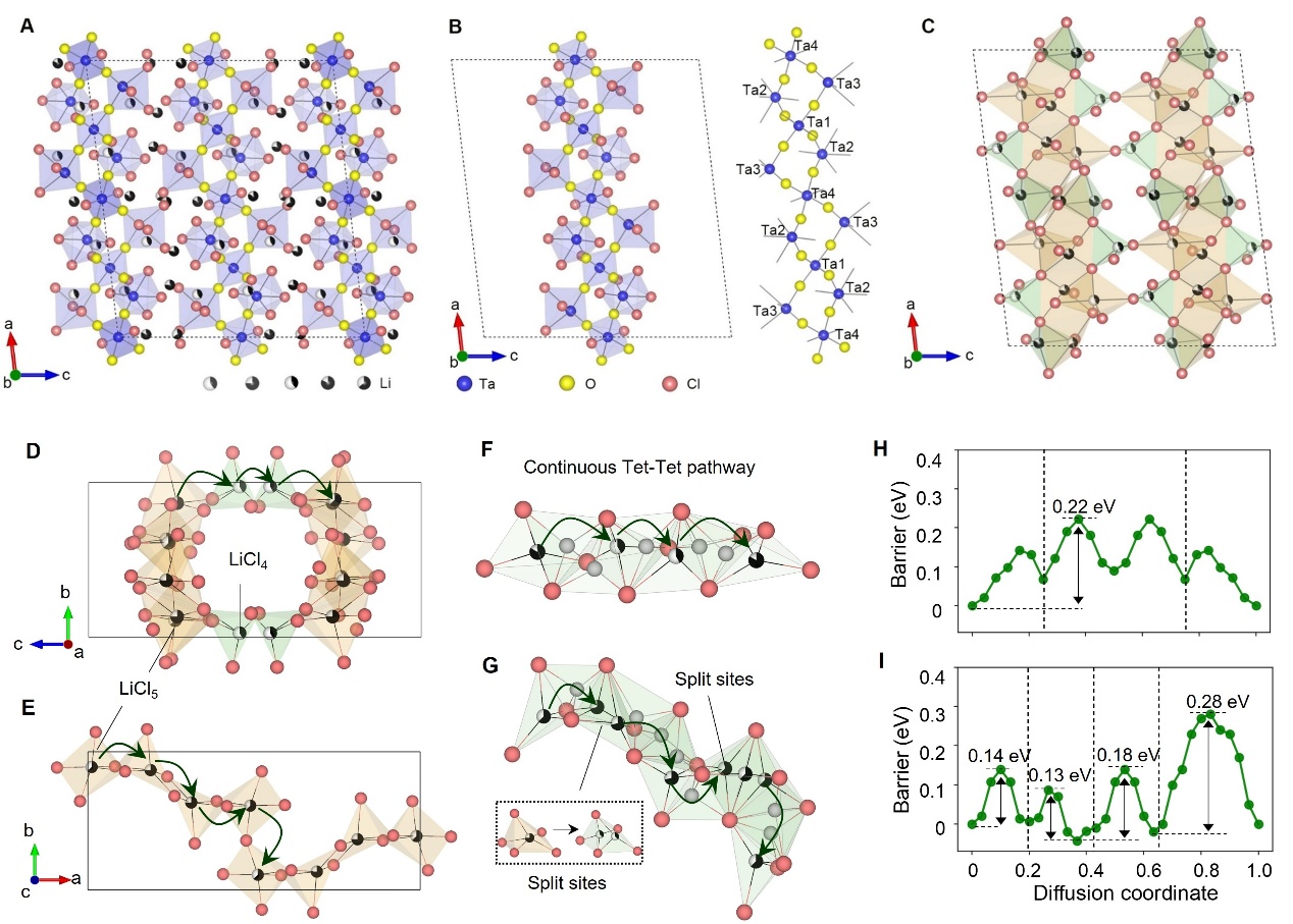 图2、Li3Ta3O4Cl10电解质的晶体结构和传输机理