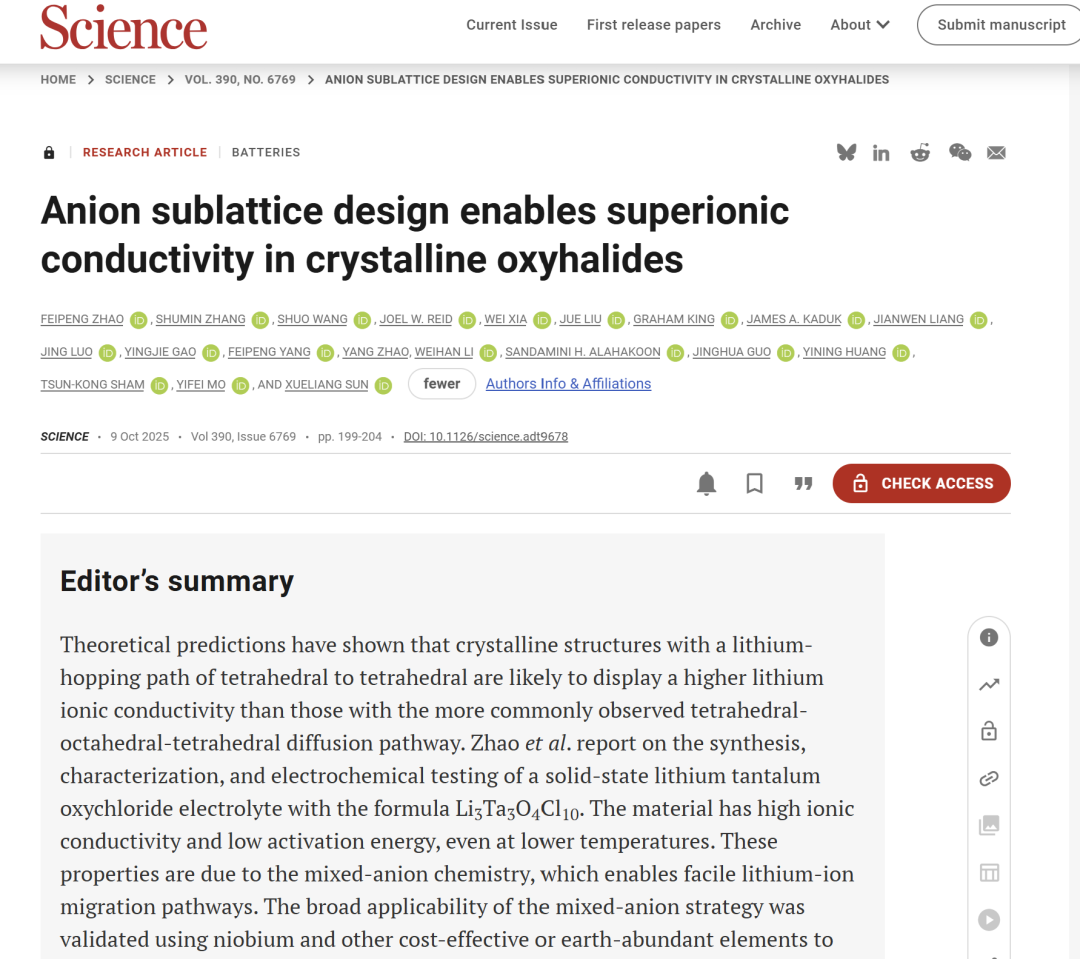 宁波东方理工大学孙学良院士团队,联合美国马里兰大学莫一非教授团队,以“阴离子亚晶格设计实现晶态卤氧化物超高离子电导率(Anion sublattice design enables superionic conductivity in crystalline oxyhalides)”为题,北京时间10月10日,相关研究成果发表在Science。研究人员开发了一种新型超离子导体:Li3Ta3O4Cl10,刷新了卤化物基固态电解质的室温离子电导率,达到了13.7毫西门子每厘米(mS/cm),并实现了零下50度环境下超稳定的全固态电池。