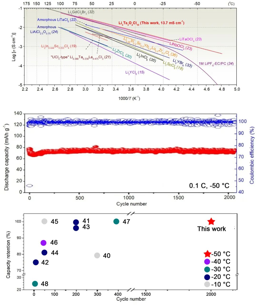 图3、Li3Ta3O4Cl10电解质的离子电导率及其低温电池应用
