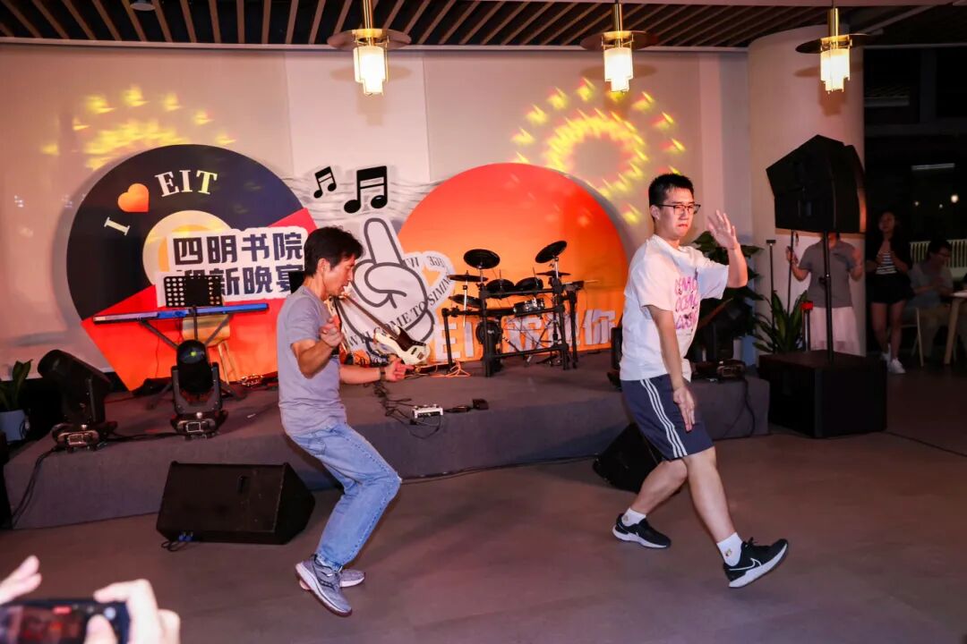 周明(左)在迎新晚宴上与本科生“斗舞”。摄影:郭驰